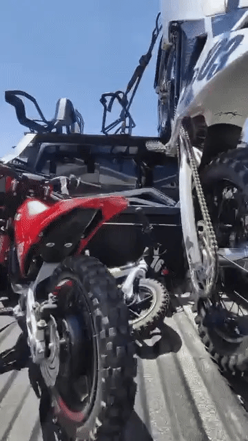 - Not Recommended, but possible: If you’re feeling zesty, 1 person can lift a dirt bike into the tray. Then, while holding the dirtbike steady, attach the tie downs